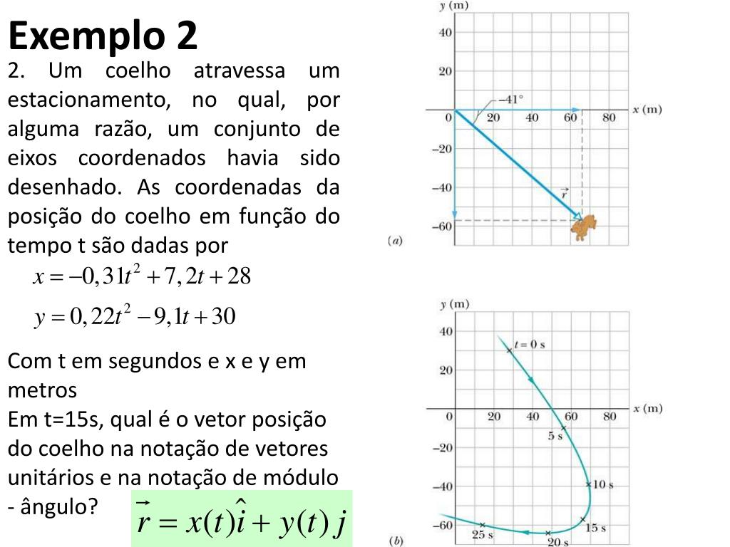 Exemplo 2 2. Um coelho atravessa um estacionamento, no qual, por alguma razão, um conjunto de eixos coordenados havia sido desenhado. As coordenadas da posição do coelho em função do tempo t são dadas por Com t em segundos e x e y em metros Em t=15s, qual é o vetor posição do coelho na notação de vetores unitários e na notação de módulo - ângulo?