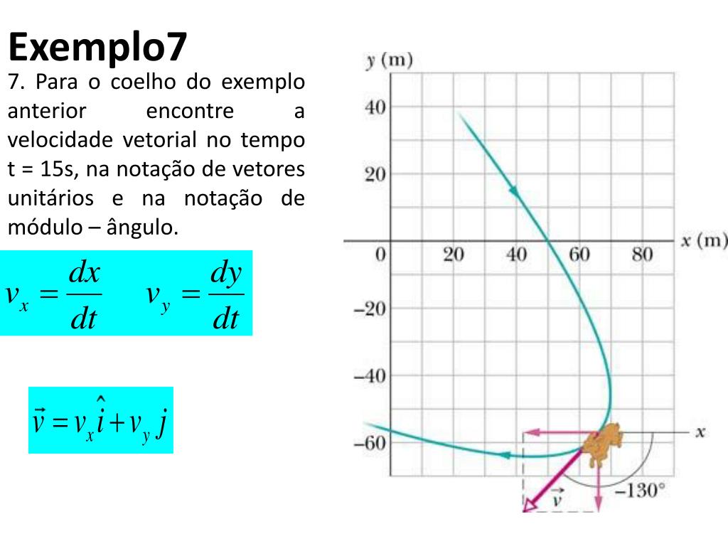 Exemplo7 7. Para o coelho do exemplo anterior encontre a velocidade vetorial no tempo t = 15s, na notação de vetores unitários e na notação de módulo – ângulo.