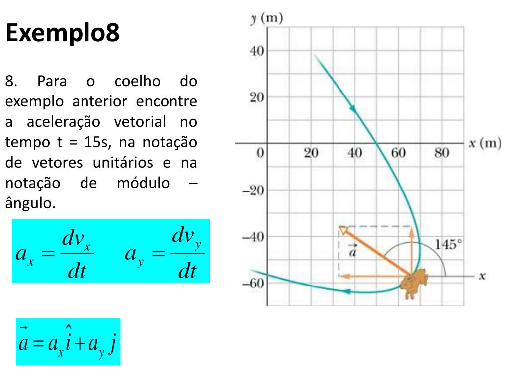 Exemplo8 8. Para o coelho do exemplo anterior encontre a aceleração vetorial no tempo t = 15s, na notação de vetores unitários e na notação de módulo – ângulo.