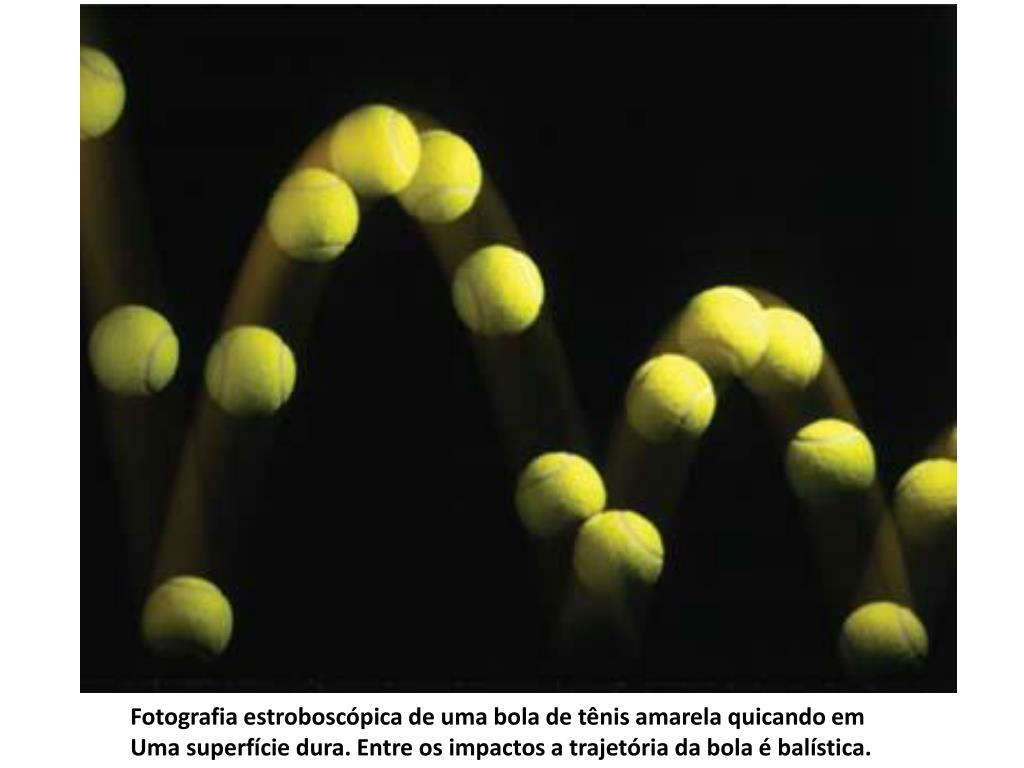 Fotografia estroboscópica de uma bola de tênis amarela quicando em Uma superfície dura. Entre os impactos a trajetória da bola é balística.