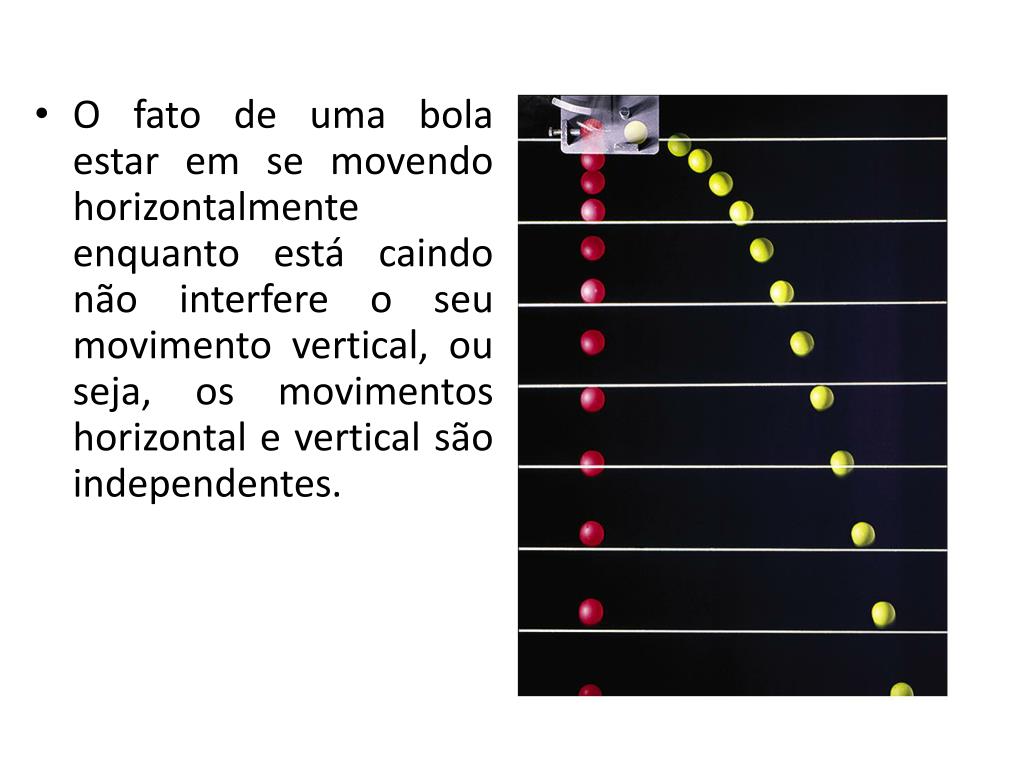 O fato de uma bola estar em se movendo horizontalmente enquanto está caindo não interfere o seu movimento vertical, ou seja, os movimentos horizontal e vertical são independentes.
