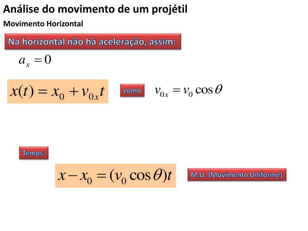 Análise do movimento de um projétil Movimento Horizontal Na horizontal não há aceleração, assim: como Temos: M.U. (Movimento Uniforme)