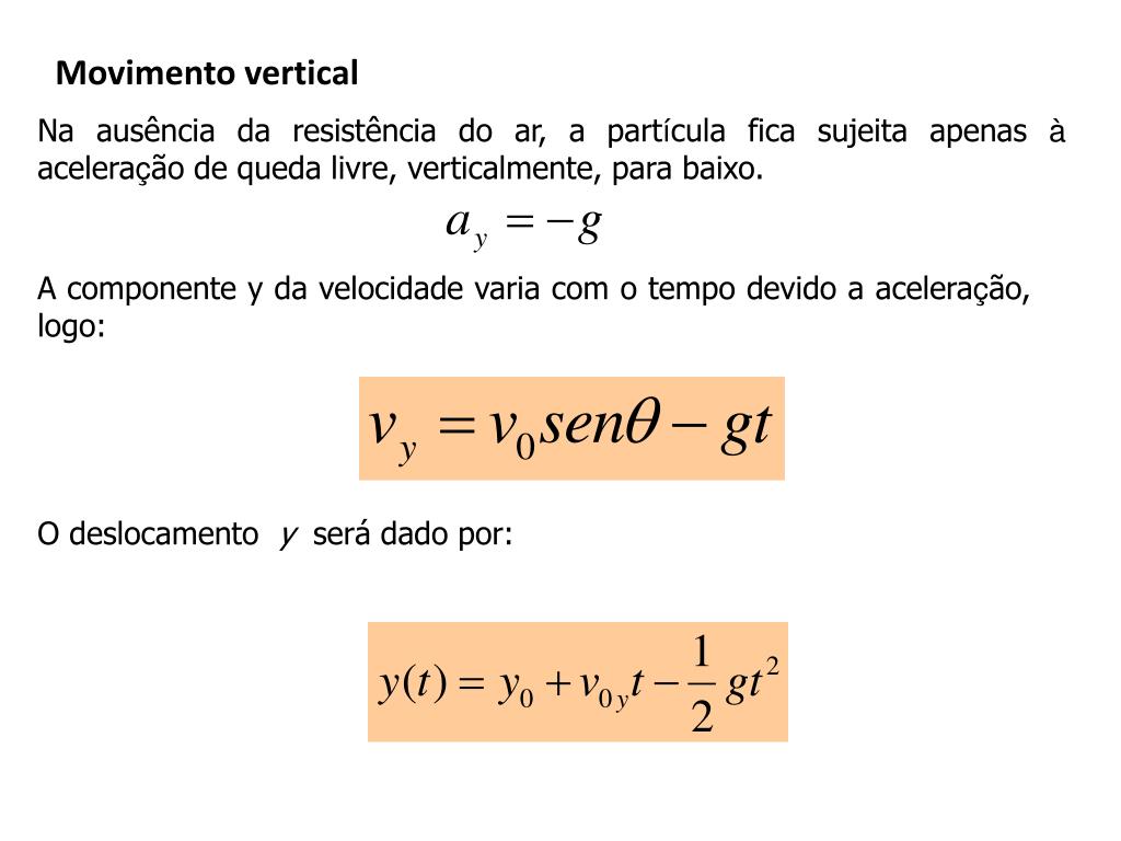 Movimento vertical Na ausência da resistência do ar, a partícula fica sujeita apenas à aceleração de queda livre, verticalmente, para baixo. A componente y da velocidade varia com o tempo devido a aceleração, logo: O deslocamento y será dado por: