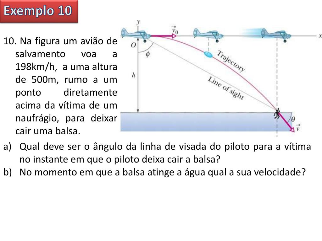 Exemplo 10 10. Na figura um avião de salvamento voa a 198km/h, a uma altura de 500m, rumo a um ponto diretamente acima da vítima de um naufrágio, para deixar cair uma balsa. • Qual deve ser o ângulo da linha de visada do piloto para a vítima no instante em que o piloto deixa cair a balsa? • No momento em que a balsa atinge a água qual a sua velocidade?
