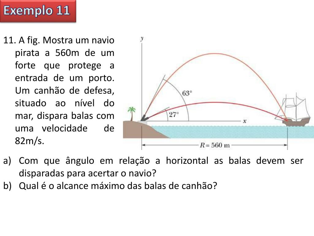 Exemplo 11 11. A fig. Mostra um navio pirata a 560m de um forte que protege a entrada de um porto. Um canhão de defesa, situado ao nível do mar, dispara balas com uma velocidade de 82m/s. • Com que ângulo em relação a horizontal as balas devem ser disparadas para acertar o navio? • Qual é o alcance máximo das balas de canhão?