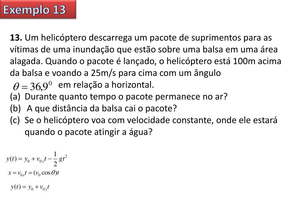 Exemplo 13 • 13. Um helicóptero descarrega um pacote de suprimentos para as vítimas de uma inundação que estão sobre uma balsa em uma área alagada. Quando o pacote é lançado, o helicóptero está 100m acima da balsa e voando a 25m/s para cima com um ângulo • em relação a horizontal. • Durante quanto tempo o pacote permanece no ar? • A que distância da balsa cai o pacote? • Se o helicóptero voa com velocidade constante, onde ele estará quando o pacote atingir a água?