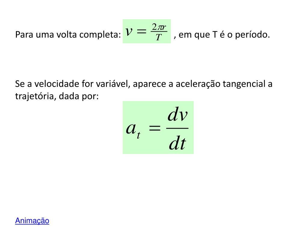 Para uma volta completa: , em que T é o período. Se a velocidade for variável, aparece a aceleração tangencial a trajetória, dada por: Animação