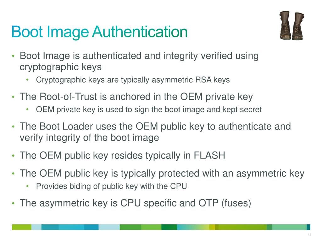 Boot Image Authentication • Boot Image is authenticated and integrity verified using cryptographic keys • Cryptographic keys are typically asymmetric RSA keys • The Root-of-Trust is anchored in the OEM private key • OEM private key is used to sign the boot image and kept secret • The Boot Loader uses the OEM public key to authenticate and verify integrity of the boot image • The OEM public key resides typically in FLASH • The OEM public key is typically protected with an asymmetric key • Provides biding of public key with the CPU • The asymmetric key is CPU specific and OTP (fuses)