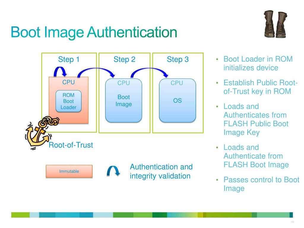 Secure Boot Chain Step 1 Step 2 Step 3 • Boot Loader authenticates and validates integrity of the Boot Image • Boot Image authenticates and validates integrity of the OS • OS is launched CPU ROM Boot Loader CPU CPU OS Boot Image Root-of-Trust Authentication and integrity validation Immutable