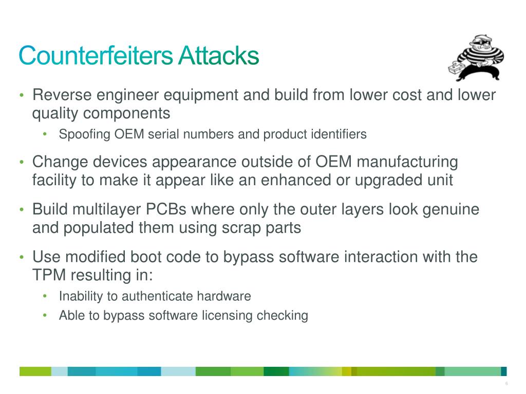 Counterfeiters Attacks • Reverse engineer equipment and build from lower cost and lower quality components • Spoofing OEM serial numbers and product identifiers • Change devices appearance outside of OEM manufacturing facility to make it appear like an enhanced or upgraded unit • Build multilayer PCBs where only the outer layers look genuine and populated them using scrap parts • Use modified boot code to bypass software interaction with the TPM resulting in: • Inability to authenticate hardware • Able to bypass software licensing checking