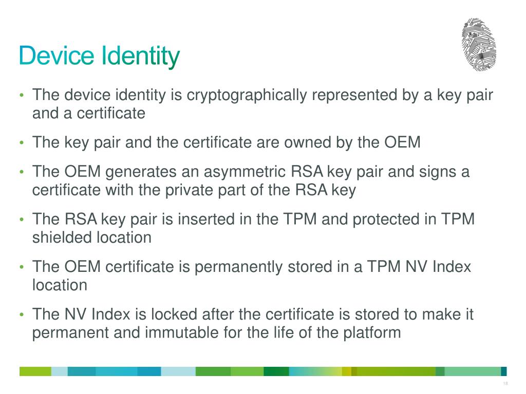 Device Identity • The device identity is cryptographically represented by a key pair and a certificate • The key pair and the certificate are owned by the OEM • The OEM generates an asymmetric RSA key pair and signs a certificate with the private part of the RSA key • The RSA key pair is inserted in the TPM and protected in TPM shielded location • The OEM certificate is permanently stored in a TPM NV Index location • The NV Index is locked after the certificate is stored to make it permanent and immutable for the life of the platform