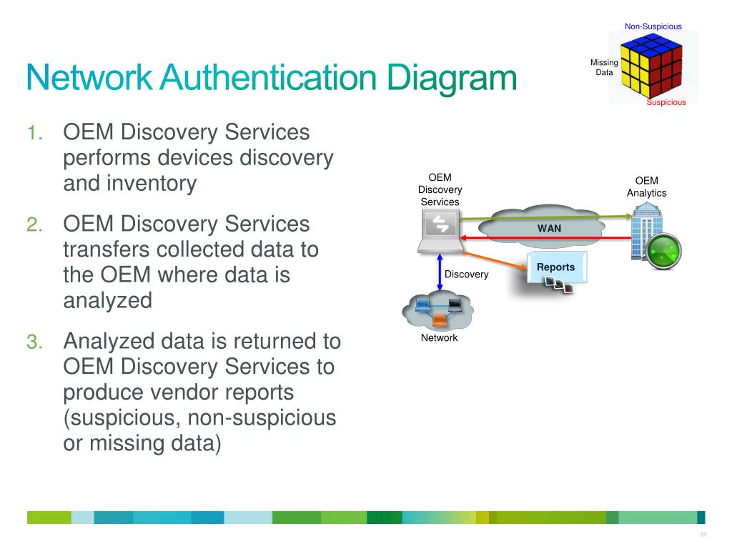 Reports Non-Suspicious Network Authentication Diagram Missing Data OEM Discovery Services OEM Analytics Suspicious • OEM Discovery Services performs devices discovery and inventory • OEM Discovery Services transfers collected data to the OEM where data is analyzed • Analyzed data is returned to OEM Discovery Services to produce vendor reports (suspicious, non-suspicious or missing data) WAN Customer Network Discovery Network