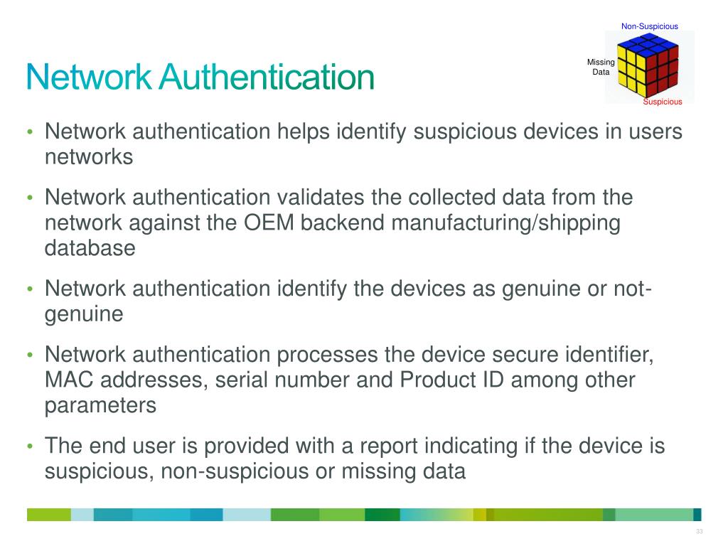 Non-Suspicious Network Authentication Missing Data Suspicious • Network authentication helps identify suspicious devices in users networks • Network authentication validates the collected data from the network against the OEM backend manufacturing/shipping database • Network authentication identify the devices as genuine or not-genuine • Network authentication processes the device secure identifier, MAC addresses, serial number and Product ID among other parameters • The end user is provided with a report indicating if the device is suspicious, non-suspicious or missing data