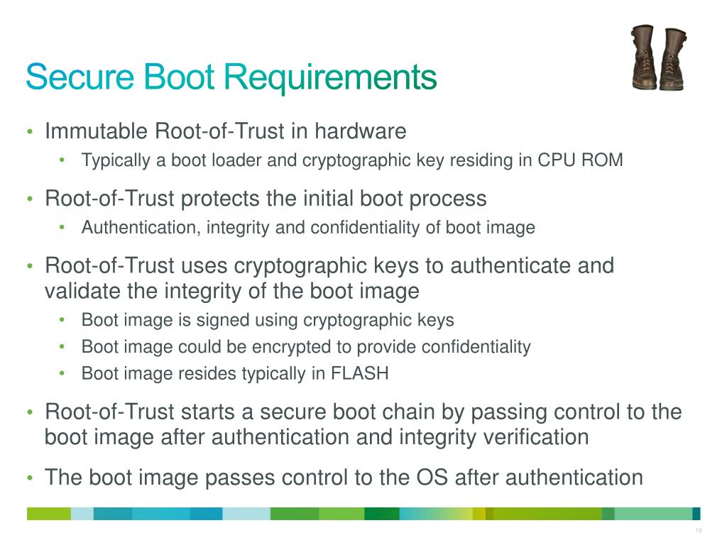 Secure Boot Requirements • Immutable Root-of-Trust in hardware • Typically a boot loader and cryptographic key residing in CPU ROM • Root-of-Trust protects the initial boot process • Authentication, integrity and confidentiality of boot image • Root-of-Trust uses cryptographic keys to authenticate and validate the integrity of the boot image • Boot image is signed using cryptographic keys • Boot image could be encrypted to provide confidentiality • Boot image resides typically in FLASH • Root-of-Trust starts a secure boot chain by passing control to the boot image after authentication and integrity verification • The boot image passes control to the OS after authentication