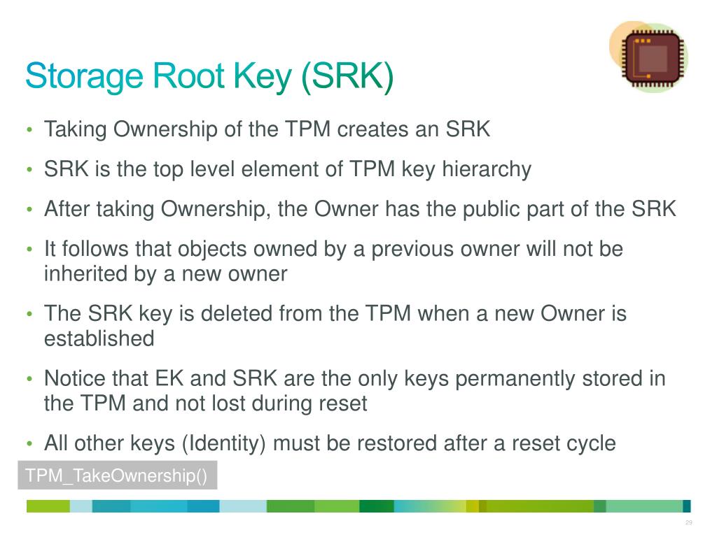 Storage Root Key (SRK) • Taking Ownership of the TPM creates an SRK • SRK is the top level element of TPM key hierarchy • After taking Ownership, the Owner has the public part of the SRK • It follows that objects owned by a previous owner will not be inherited by a new owner • The SRK key is deleted from the TPM when a new Owner is established • Notice that EK and SRK are the only keys permanently stored in the TPM and not lost during reset • All other keys (Identity) must be restored after a reset cycle TPM_TakeOwnership()