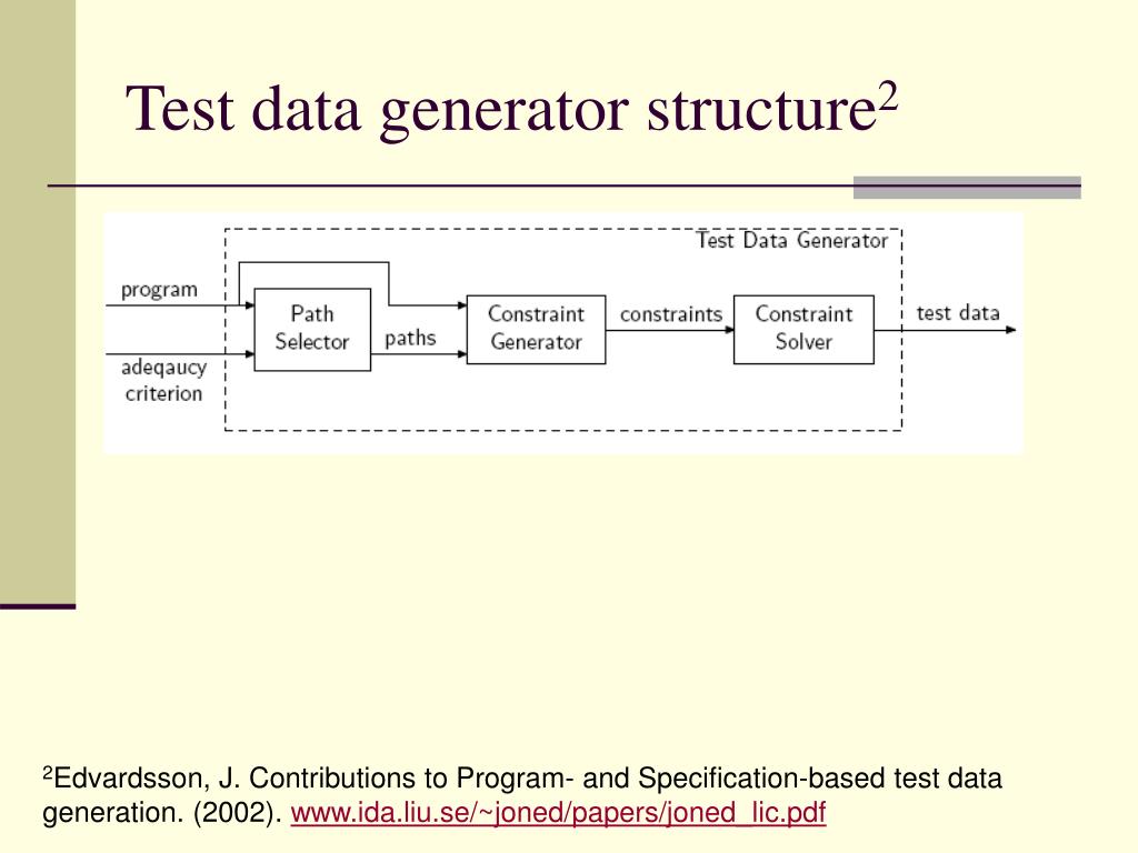 Test data generator structure2 2Edvardsson, J. Contributions to Program- and Specification-based test data generation. (2002). www.ida.liu.se/~joned/papers/joned_lic.pdf
