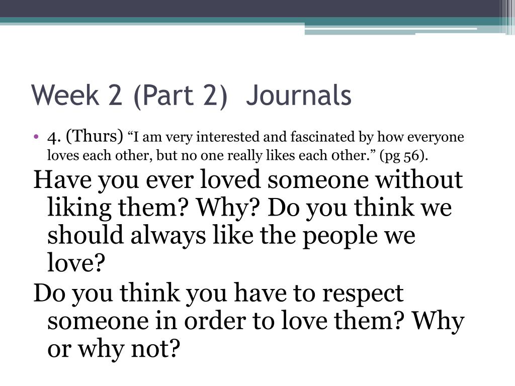 Week 2 (Part 2) Journals • 4. (Thurs) “I am very interested and fascinated by how everyone loves each other, but no one really likes each 0ther.” (pg 56). Have you ever loved someone without liking them? Why? Do you think we should always like the people we love? Do you think you have to respect someone in order to love them? Why or why not?