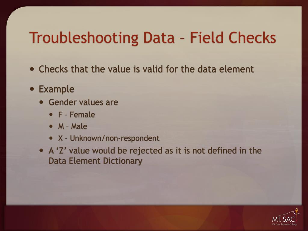 Troubleshooting Data – Field Checks • Checks that the value is valid for the data element • Example • Gender values are • F – Female • M – Male • X – Unknown/non-respondent • A ‘Z’ value would be rejected as it is not defined in the Data Element Dictionary