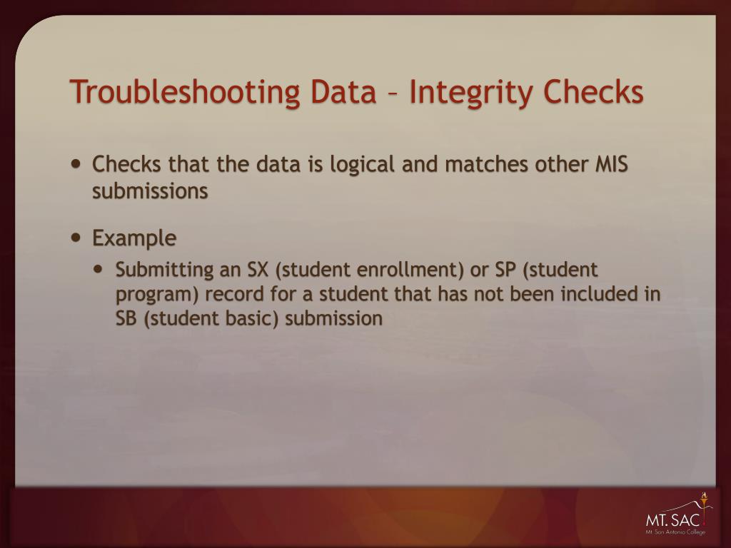 Troubleshooting Data – Integrity Checks • Checks that the data is logical and matches other MIS submissions • Example • Submitting an SX (student enrollment) or SP (student program) record for a student that has not been included in SB (student basic) submission