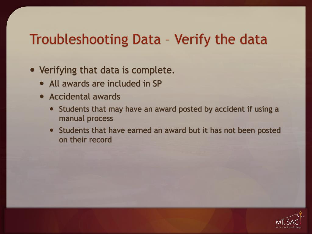Troubleshooting Data – Verify the data • Verifying that data is complete. • All awards are included in SP • Accidental awards • Students that may have an award posted by accident if using a manual process • Students that have earned an award but it has not been posted on their record
