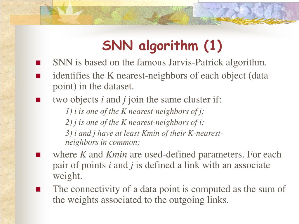 SNN algorithm (1) • SNN is based on the famous Jarvis-Patrick algorithm. • identifies the K nearest-neighbors of each object (data point) in the dataset. • two objects i and j join the same cluster if: 1) i is one of the K nearest-neighbors of j; 2) j is one of the K nearest-neighbors of i; 3) i and j have at least Kmin of their K-nearest- neighbors in common; • where K and Kmin are used-defined parameters. For each pair of points i and j is defined a link with an associate weight. • The connectivity of a data point is computed as the sum of the weights associated to the outgoing links.