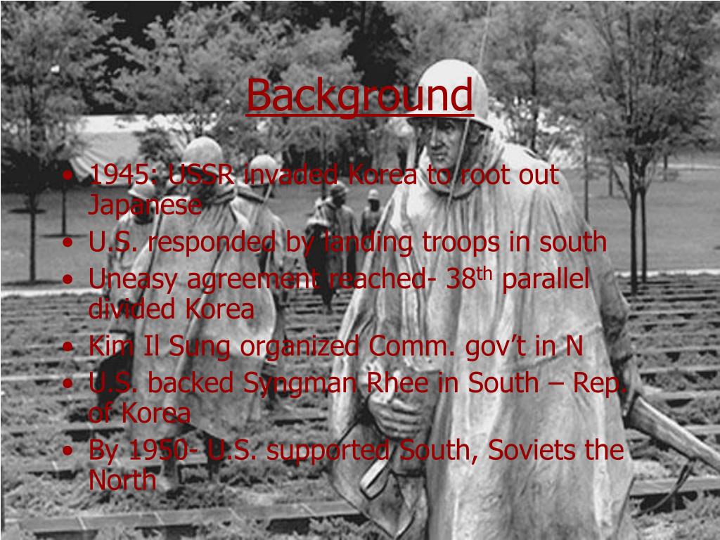 Background • 1945: USSR invaded Korea to root out Japanese • U.S. responded by landing troops in south • Uneasy agreement reached- 38th parallel divided Korea • Kim Il Sung organized Comm. gov’t in N • U.S. backed Syngman Rhee in South – Rep. of Korea • By 1950- U.S. supported South, Soviets the North