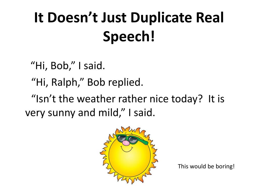 It Doesn’t Just Duplicate Real Speech! “Hi, Bob,” I said. “Hi, Ralph,” Bob replied. “Isn’t the weather rather nice today? It is very sunny and mild,” I said. This would be boring!