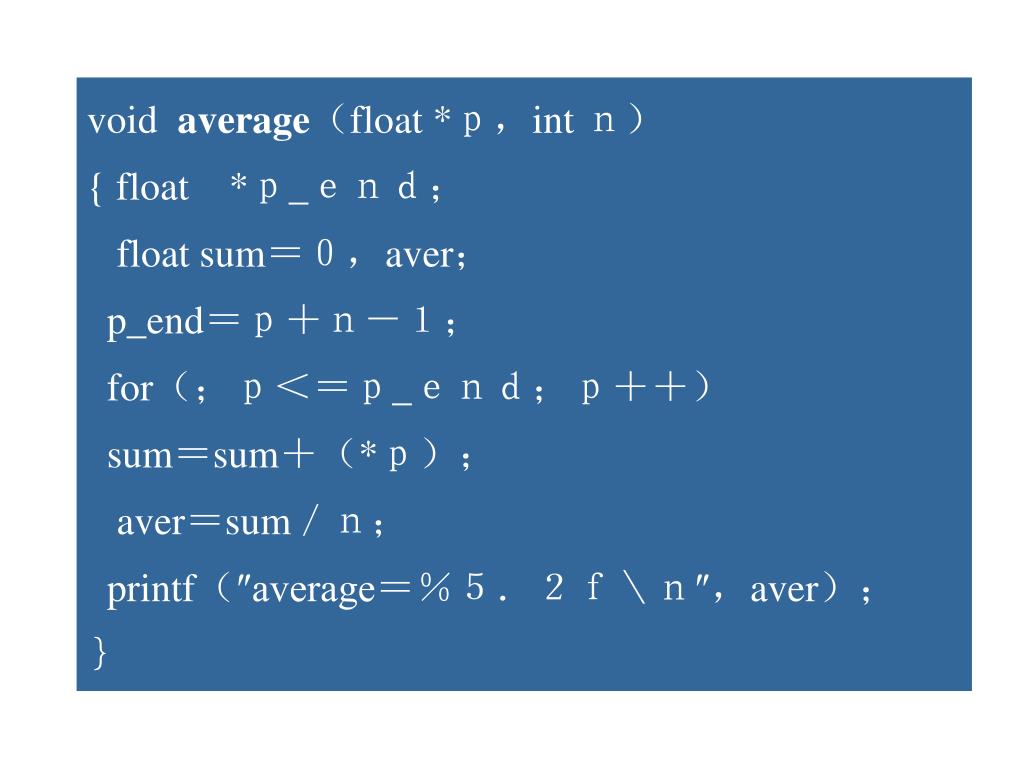 void average(float *p,int n) { float*p_end; float sum=0,aver; p_end=p+n-1; for(;p<=p_end;p++) sum=sum+(*p); aver=sum/n; printf(″average=%5.2f\n″,aver); }