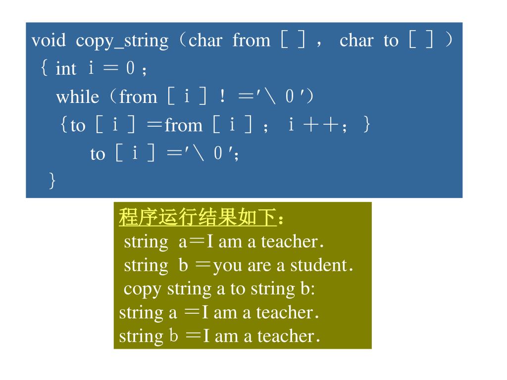 void copy_string(char from[ ], char to[ ]) { int i=0; while(from[i]!=′\0′) {to[i]=from[i];i++;} to[i]=′\0′; } 程序运行结果如下: string a=I am a teacher. string b=you are a student. copy string a to string b: string a =I am a teacher. stringb=I am a teacher.