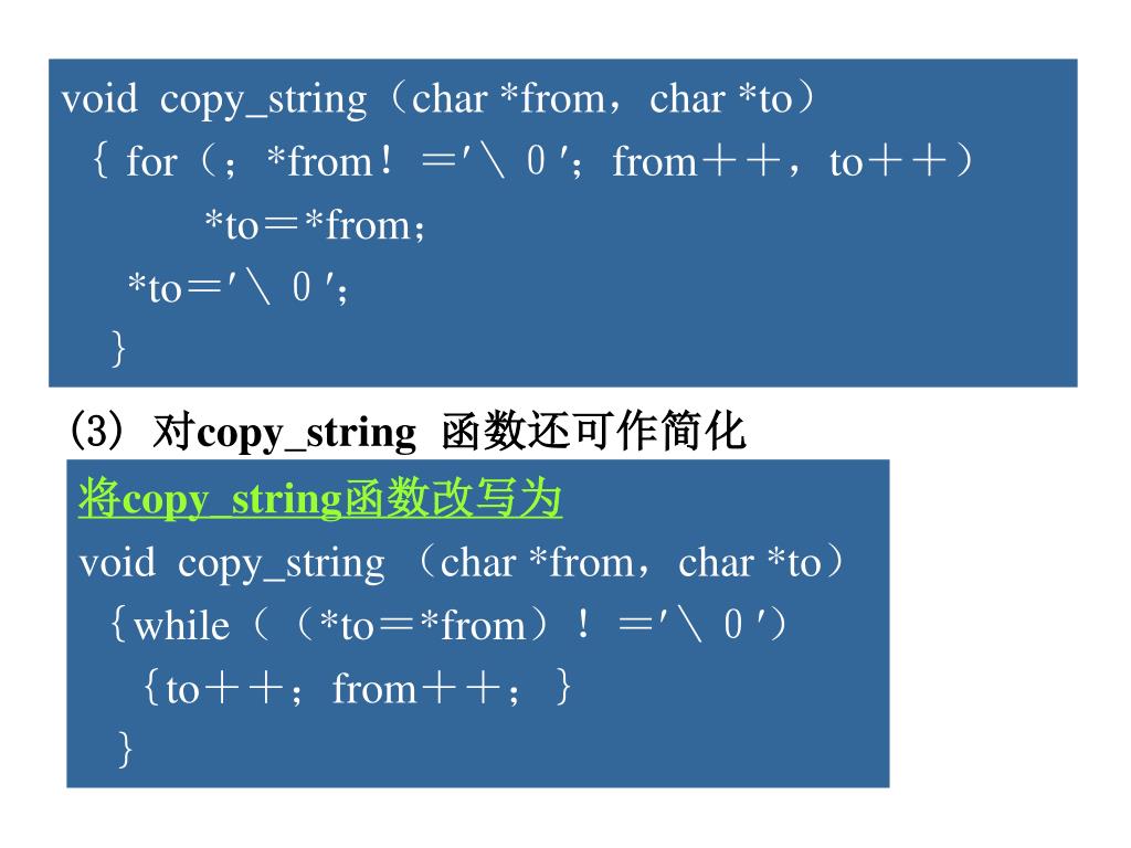void copy_string(char *from,char *to) { for(;*from!=′\0′;from++,to++) *to=*from; *to=′\0′; } (3) 对copy_string函数还可作简化 将copy_string函数改写为 void copy_string (char *from,char *to) {while((*to=*from)!=′\0′) {to++;from++;} }
