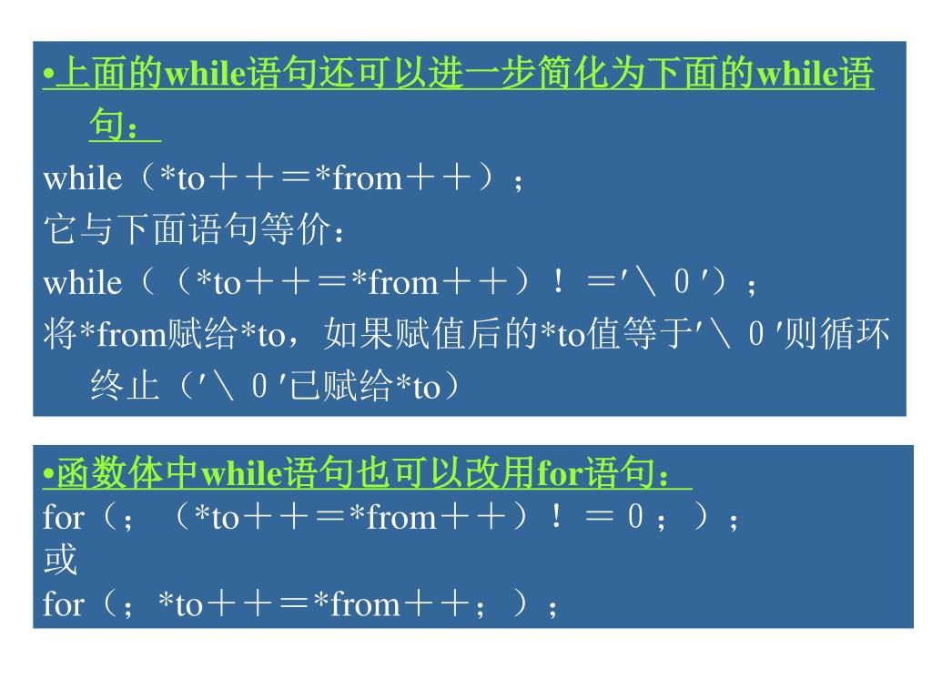 •上面的while语句还可以进一步简化为下面的while语句:•上面的while语句还可以进一步简化为下面的while语句: while(*to++=*from++); 它与下面语句等价: while((*to++=*from++)!=′\0′); 将*from赋给*to,如果赋值后的*to值等于′\0′则循环终止(′\0′已赋给*to) •函数体中while语句也可以改用for语句: for(;(*to++=*from++)!=0;); 或 for(;*to++=*from++;);