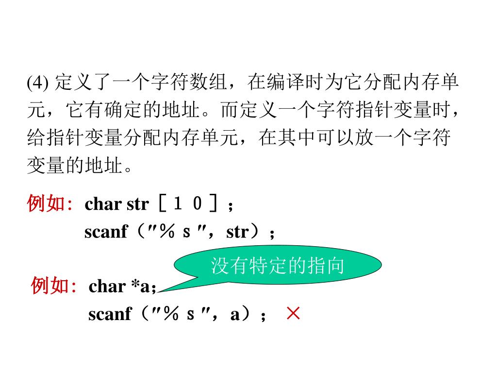 (4) 定义了一个字符数组,在编译时为它分配内存单元,它有确定的地址。而定义一个字符指针变量时,给指针变量分配内存单元,在其中可以放一个字符变量的地址。 例如:char str[10]; scanf(″%s″,str); 没有特定的指向 例如:char *a; scanf(″%s″,a); ×