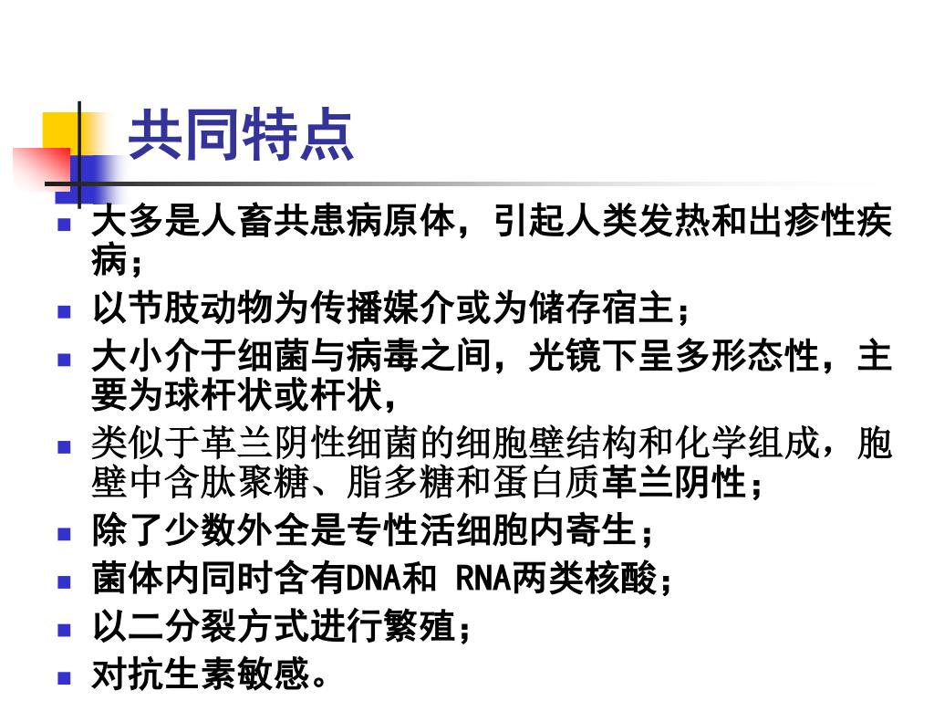 共同特点 • 大多是人畜共患病原体,引起人类发热和出疹性疾病; • 以节肢动物为传播媒介或为储存宿主; • 大小介于细菌与病毒之间,光镜下呈多形态性,主要为球杆状或杆状, • 类似于革兰阴性细菌的细胞壁结构和化学组成,胞壁中含肽聚糖、脂多糖和蛋白质革兰阴性; • 除了少数外全是专性活细胞内寄生; • 菌体内同时含有DNA和 RNA两类核酸; • 以二分裂方式进行繁殖; • 对抗生素敏感。