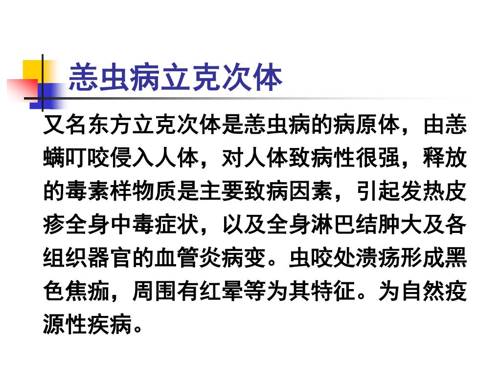 恙虫病立克次体 又名东方立克次体是恙虫病的病原体,由恙 螨叮咬侵入人体,对人体致病性很强,释放 的毒素样物质是主要致病因素,引起发热皮 疹全身中毒症状,以及全身淋巴结肿大及各 组织器官的血管炎病变。虫咬处溃疡形成黑 色焦痂,周围有红晕等为其特征。为自然疫 源性疾病。