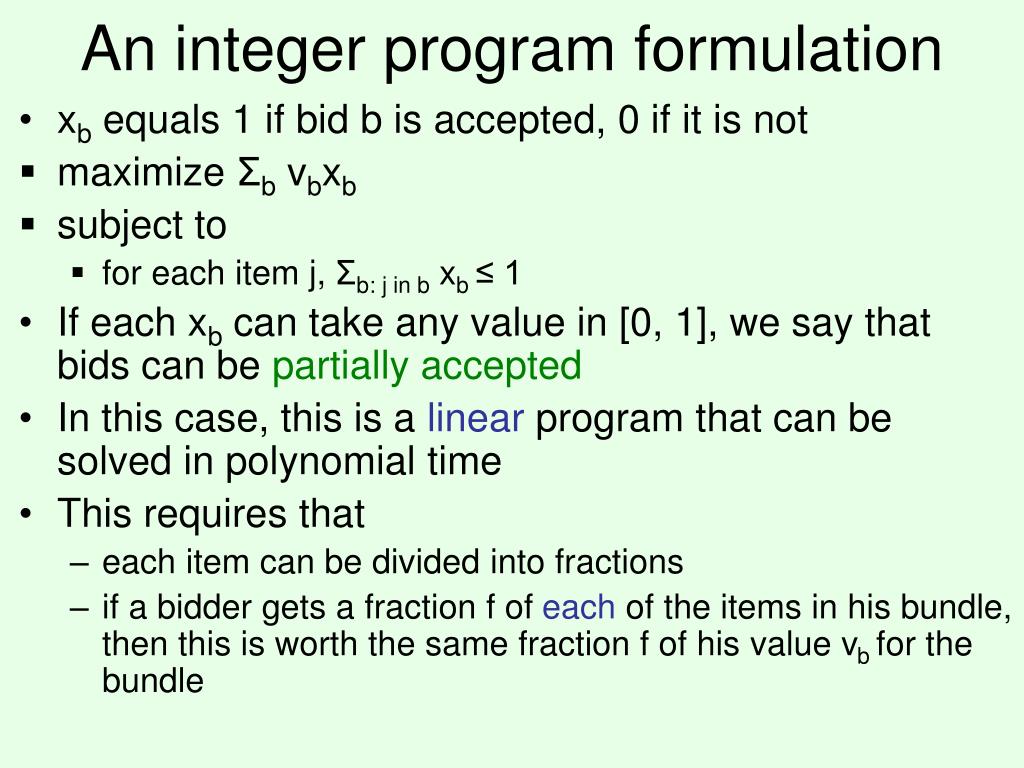 An integer program formulation • xb equals 1 if bid b is accepted, 0 if it is not • maximize Σb vbxb • subject to • for each item j, Σb: j in b xb ≤ 1 • If each xb can take any value in [0, 1], we say that bids can be partially accepted • In this case, this is a linear program that can be solved in polynomial time • This requires that • each item can be divided into fractions • if a bidder gets a fraction f of each of the items in his bundle, then this is worth the same fraction f of his value vb for the bundle