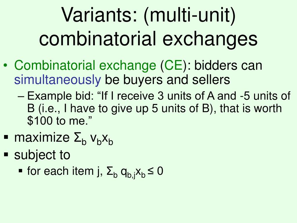 Variants: (multi-unit) combinatorial exchanges • Combinatorial exchange (CE): bidders can simultaneously be buyers and sellers • Example bid: “If I receive 3 units of A and -5 units of B (i.e., I have to give up 5 units of B), that is worth $100 to me.” • maximize Σb vbxb • subject to • for each item j, Σb qb,jxb ≤ 0