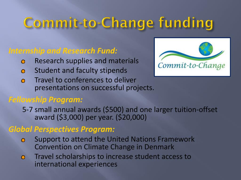 Commit-to-Change funding Internship and Research Fund: • Research supplies and materials • Student and faculty stipends • Travel to conferences to deliver presentations on successful projects. Fellowship Program: 5-7 small annual awards ($500) and one larger tuition-offset award ($3,000) per year. ($20,000) Global Perspectives Program: • Support to attend the United Nations Framework Convention on Climate Change in Denmark • Travel scholarships to increase student access to international experiences