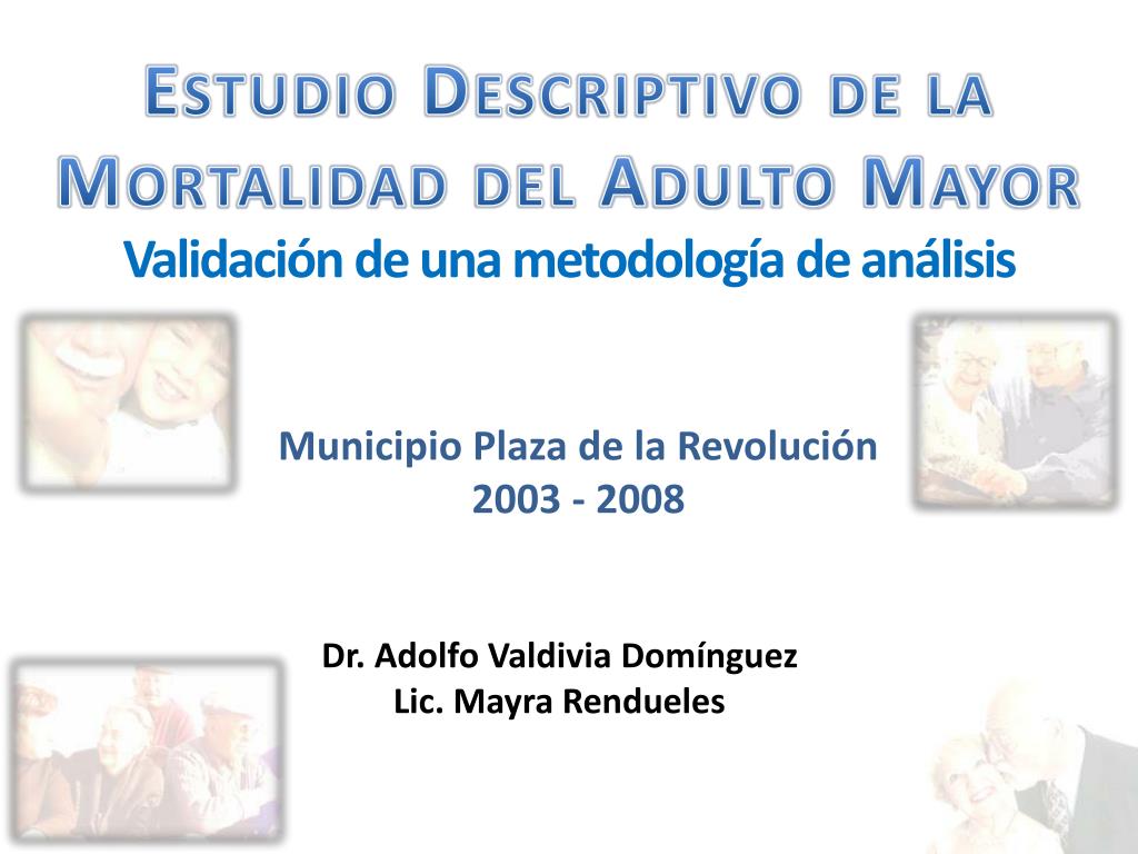 Estudio Descriptivo de la Mortalidad del Adulto Mayor Validación de una metodología de análisis Municipio Plaza de la Revolución 2003 - 2008 Dr. Adolfo Valdivia Domínguez Lic. Mayra Rendueles