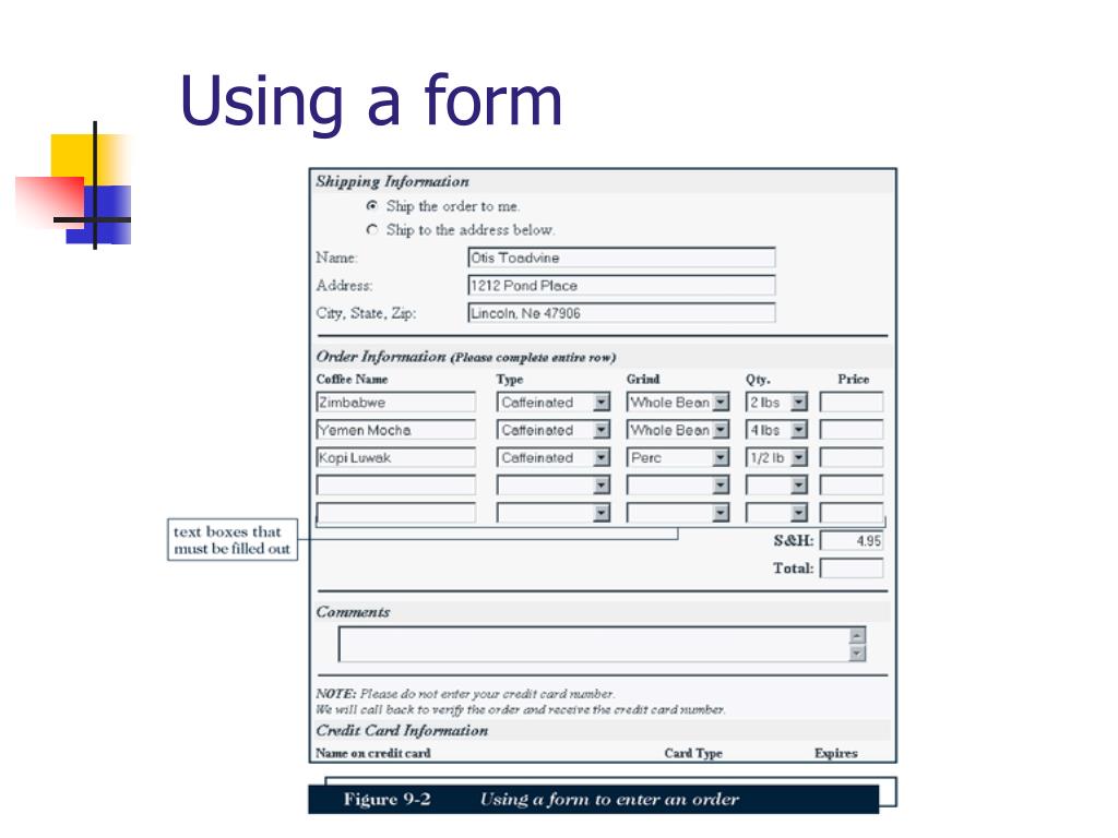 Shopping Cart • The web has no memory! • Simple static HTML forms can be used for online shopping • A more advanced way to shop online is by using a shopping carts • Shopping cart software is now standard with most e-commerce solutions