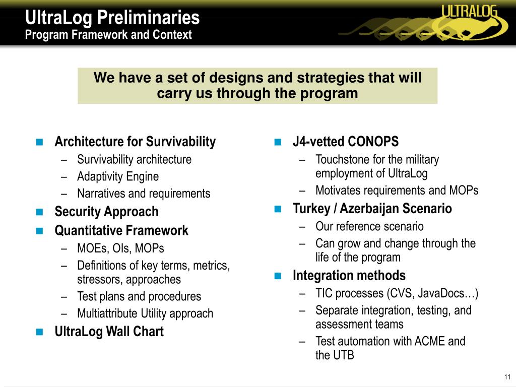 Architecture for Survivability Survivability architecture Adaptivity Engine Narratives and requirements Security Approach Quantitative Framework MOEs, OIs, MOPs Definitions of key terms, metrics, stressors, approaches Test plans and procedures Multiattribute Utility approach UltraLog Wall Chart J4-vetted CONOPS Touchstone for the military employment of UltraLog Motivates requirements and MOPs Turkey / Azerbaijan Scenario Our reference scenario Can grow and change through the life of the program Integration methods TIC processes (CVS, JavaDocs…) Separate integration, testing, and assessment teams Test automation with ACME and the UTB UltraLog PreliminariesProgram Framework and Context We have a set of designs and strategies that will carry us through the program