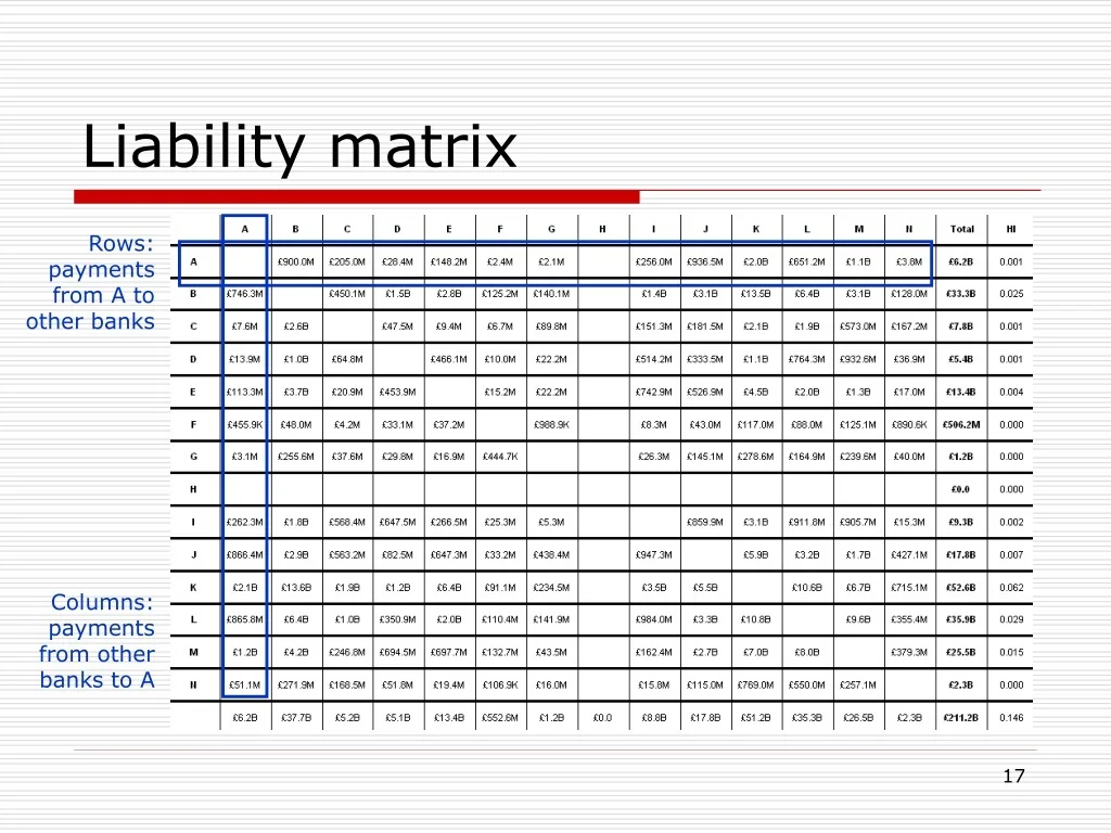 Liability matrix Rows: payments from A to other banks Columns: payments from other banks to A