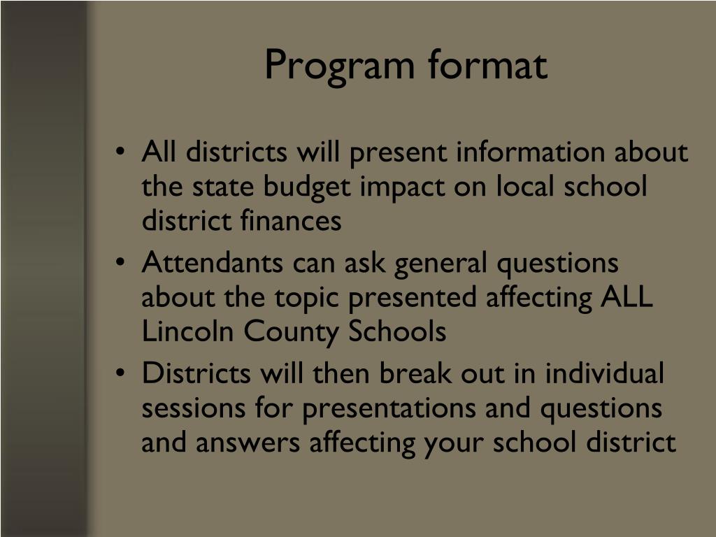 Program format • All districts will present information about the state budget impact on local school district finances • Attendants can ask general questions about the topic presented affecting ALL Lincoln County Schools • Districts will then break out in individual sessions for presentations and questions and answers affecting your school district