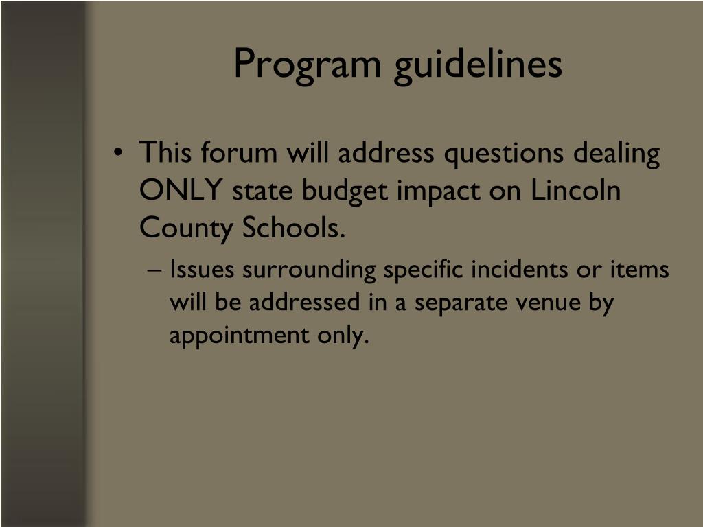 Program guidelines • This forum will address questions dealing ONLY state budget impact on Lincoln County Schools. • Issues surrounding specific incidents or items will be addressed in a separate venue by appointment only.