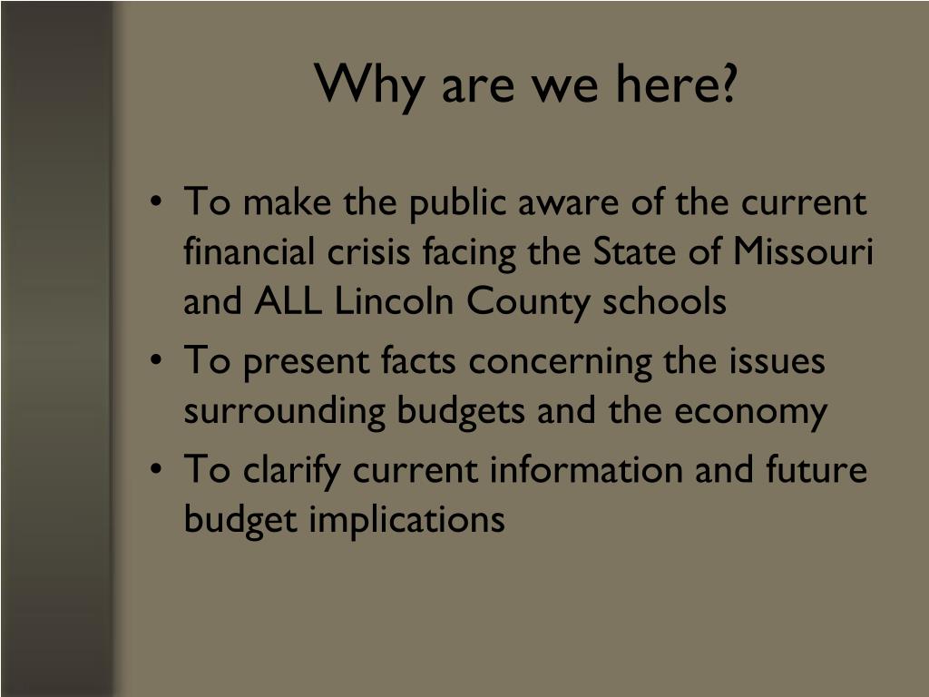 Why are we here? • To make the public aware of the current financial crisis facing the State of Missouri and ALL Lincoln County schools • To present facts concerning the issues surrounding budgets and the economy • To clarify current information and future budget implications