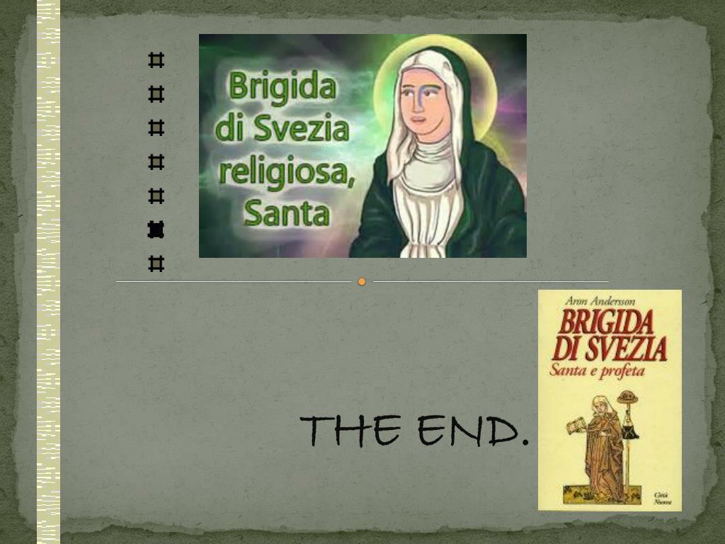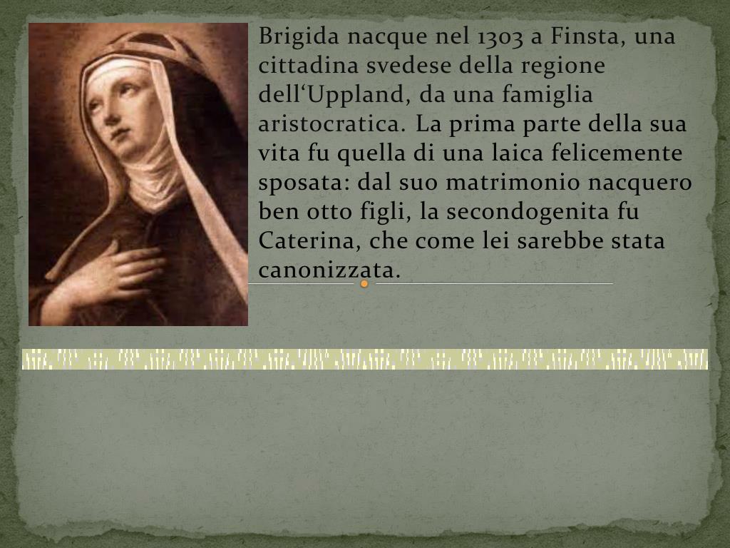 Santa Brigida di Svezia Nascita: 1303 Morte: 1373 Venerata da: ChiesaCattolica Canonizzazione: 7 Ottobre 1391 Ricorrenza: 23 Luglio Patrona di SVEZIA