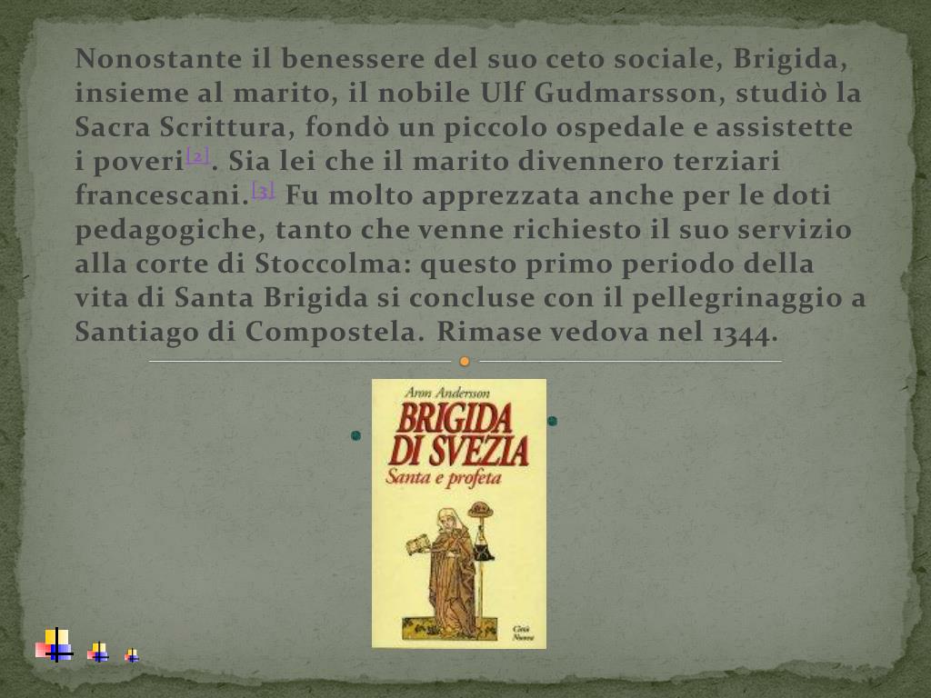 Nonostante il benessere del suo ceto sociale, Brigida, insieme al marito, il nobile UlfGudmarsson, studiò la Sacra Scrittura, fondò un piccolo ospedale e assistette i poveri[2]. Sia lei che il marito divennero terziari francescani.[3] Fu molto apprezzata anche per le doti pedagogiche, tanto che venne richiesto il suo servizio alla corte di Stoccolma: questo primo periodo della vita di Santa Brigida si concluse con il pellegrinaggio a Santiago di Compostela.Rimase vedova nel 1344.