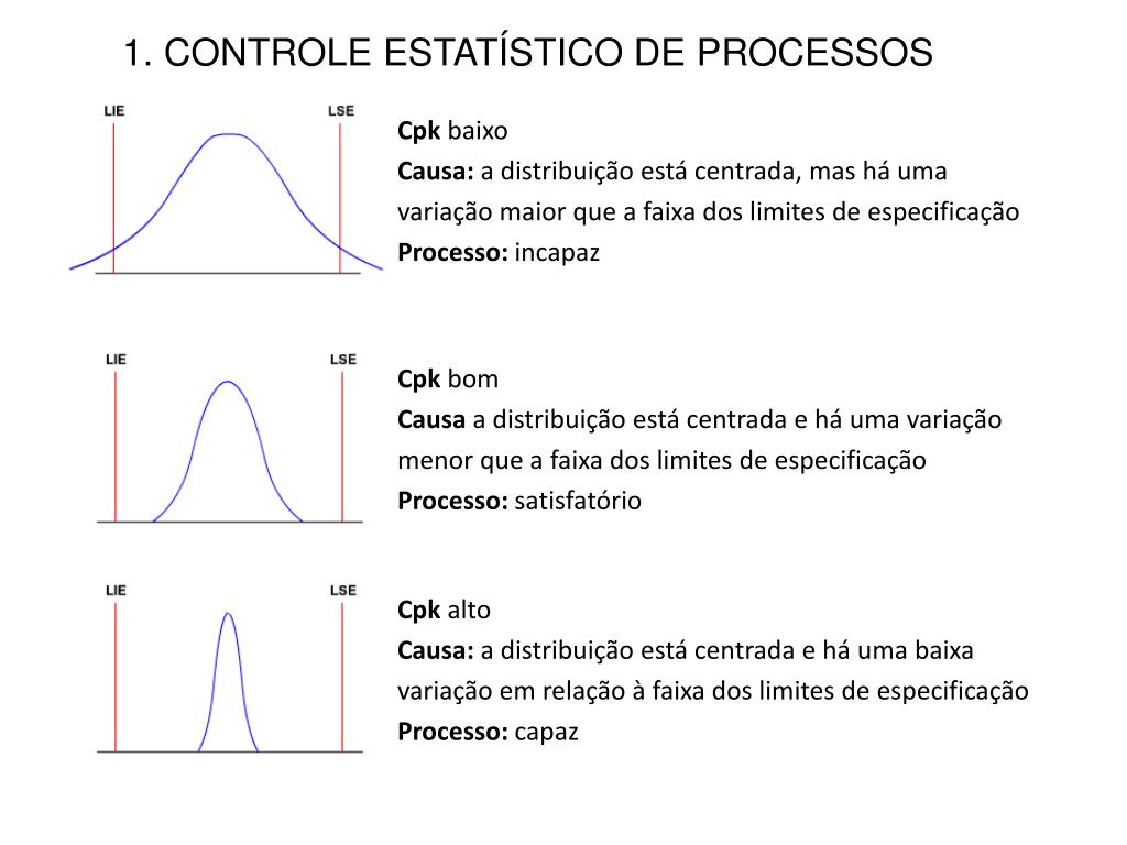 1. CONTROLE ESTATÍSTICO DE PROCESSOS Cpk baixo Causa: a distribuição está centrada, mas há uma variação maior que a faixa dos limites de especificaçãoProcesso: incapaz Cpk bom Causa a distribuição está centrada e há uma variação menor que a faixa dos limites de especificaçãoProcesso: satisfatório Cpk alto Causa: a distribuição está centrada e há uma baixa variação em relação à faixa dos limites de especificaçãoProcesso: capaz