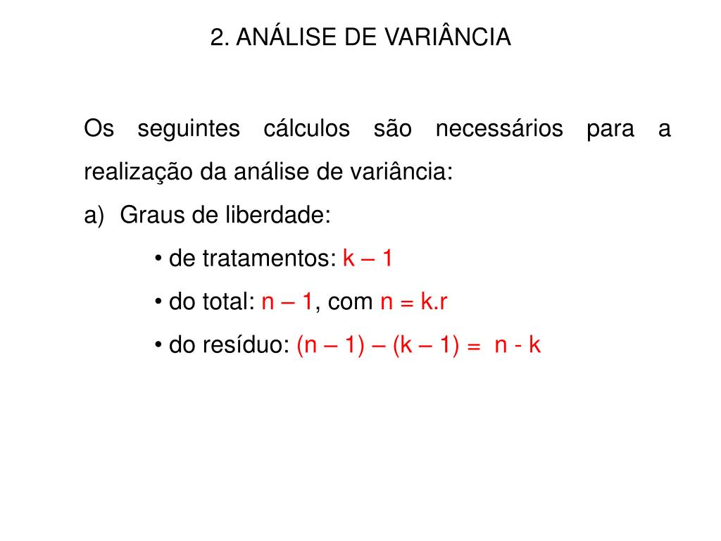 2. ANÁLISE DE VARIÂNCIA • Os seguintes cálculos são necessários para a realização da análise de variância: • Graus de liberdade: • de tratamentos: k – 1 • do total: n – 1, com n = k.r • do resíduo: (n – 1) – (k – 1) = n - k