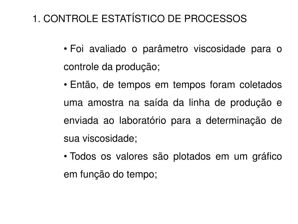 1. CONTROLE ESTATÍSTICO DE PROCESSOS • Foi avaliado o parâmetro viscosidade para o controle da produção; • Então, de tempos em tempos foram coletados uma amostra na saída da linha de produção e enviada ao laboratório para a determinação de sua viscosidade; • Todos os valores são plotados em um gráfico em função do tempo;