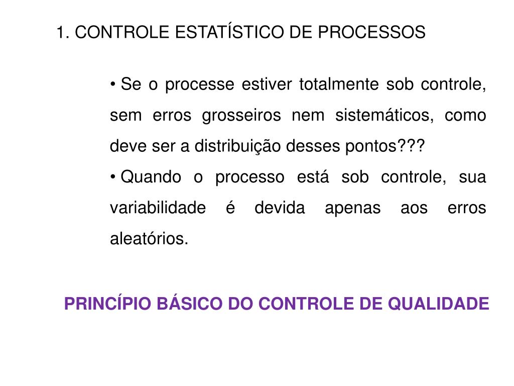 1. CONTROLE ESTATÍSTICO DE PROCESSOS • Se o processe estiver totalmente sob controle, sem erros grosseiros nem sistemáticos, como deve ser a distribuição desses pontos??? • Quando o processo está sob controle, sua variabilidade é devida apenas aos erros aleatórios. PRINCÍPIO BÁSICO DO CONTROLE DE QUALIDADE